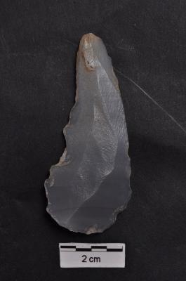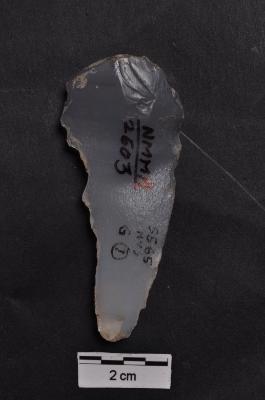 | Description / विवरण | Flake, prominent bulb with prepare striking platform, irregular ridges on dorsal surface, tapering distal end, retouches on both edges. |