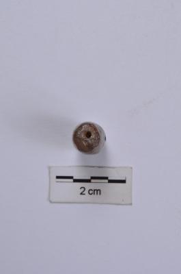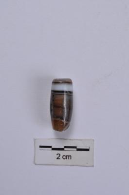 | Description / विवरण | A long cylindrical shape bead, has a circular cross section, has bands of white, black and brown colour, smooth and polished surface |