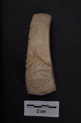 | Description / विवरण | Fragment, broad and thick piece, outer surface having incised groups of vertical lines and leaf design. It has a smooth but weathered surface |