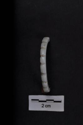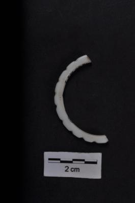 | Description / विवरण | Fragment of a half bangle irregularly circular outer surface having segments, but smaller in size possibly for a child, of pure white shell. |