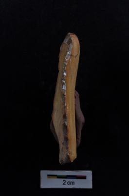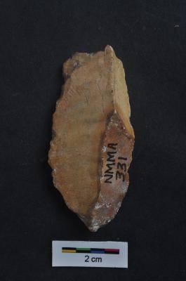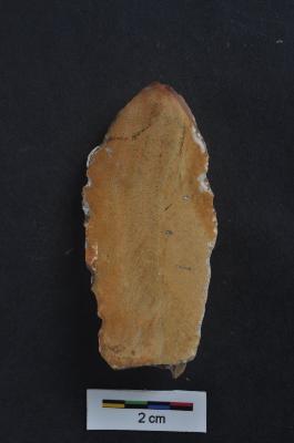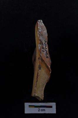 | Description / विवरण | Blade, pointed proximal end, prominent bulb with striking platform, a vertical ridge on dorsal surface, use-ware marks on both working edge. |