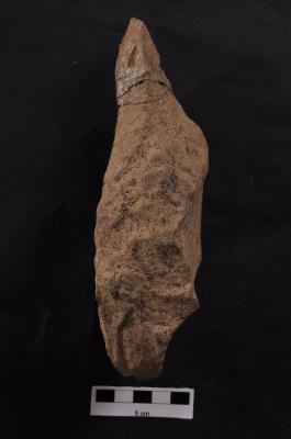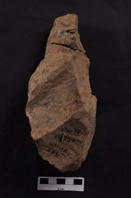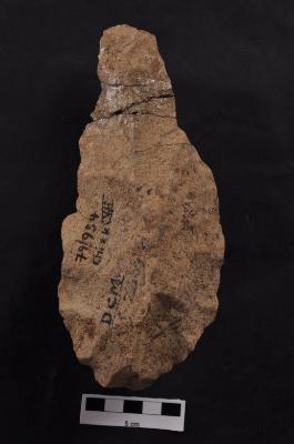 | Description / विवरण | Handaxe, leaf shaped, long pointed end, bi-facial, flaking along the periphery and dorsal surface. |