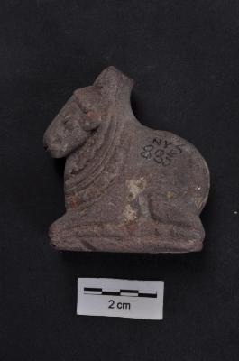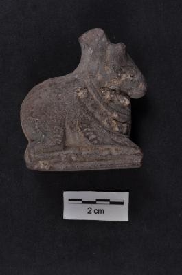 | Description / विवरण | A complete specimen of a Nandi made of red sandstone, flat rectangular base, crude workmanship, wearing a necklace of circular bells , mouth shown by a horizontal incision, one short horn extant, hump shown close to the head. |
