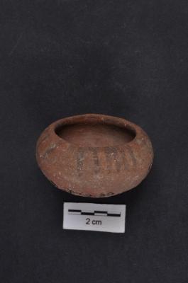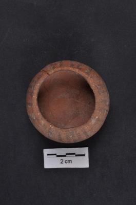 | Description / विवरण | A complete specimen of a tiny rimless bowl with a group of vertical stokes on the outer surface. |