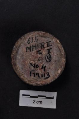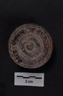 | Description / विवरण | An almost complete specimen with the flat upper surface having the decoration of incised concentric circles and ringed knob in relief in centre grayish in colour diameter 34 mm |