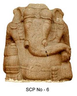 | Description / विवरण | Ganesa seated in ardha paryankasana. Conspicuously enough it is devoid of any crown or Kirita makuta and only two handed, which indeed is an important feature from iconographical point of view. The image is heavy and bulbous in proportion. It has a flat head with a head band around on the top. The ears are broad and fan like. The right hand rests on the knee vertically with a closed fist, while the left hand hangs down and bent forward holding the modaka. The trunk is short which turns immediately towards left and touches the sweetmeat in the left palm. The ornaments include a thick beaded necklace, bahuvalayas, anklets and a Naga udara bandha. It appears that the image has no yajnopavita which is another important feature. On the whole the image seems to belong to the early Chalukya idiom. |