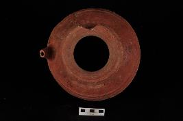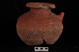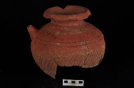 | Description / विवरण | Red ware spouted jar with over turned, beaked rim. It has globular profile. The upper half is slipped and there are two ribbing on the slipped portion. The lower half looks unslipped. The area between the aliped upper and unslipped lower portion is filled with incised designs. |