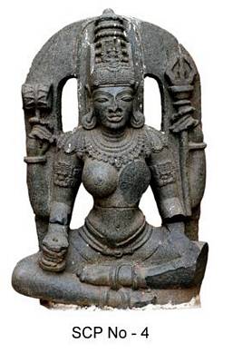 | Description / विवरण | Devi seated in Padmasana cross legged in dhyana mudra meditation posture . Her head is adorned with karanda makuta in six receding tiers and surmounted by tuft in the centre on the top. The ears are decorated with chakra kundalas. The right rear hand holds the damaru with its fore finger, while the remaining fingers point sidewards. The right front holds a flower. The left rear hand holds a three pronged trident the outer prongs bent inwards and touching the tip of the middle prong. The front left hand in broken. Around the neck are a number of haras one after the other adorning the chest portion, above the breasts. The outer necklace is made up of mango shaped beads with a central pendent. Other ornaments include bhuja kirtis and bahu valayas, wristlets and anklets. The loin is tied with a girdle mekhala with a central tassel. The image is characterized by broad fore head, angular eyes, linear eye brows and profuse ornamentation which suggest Kakatiya workmanship. |