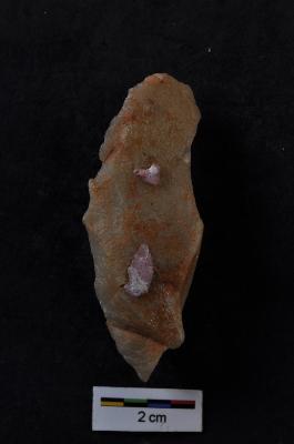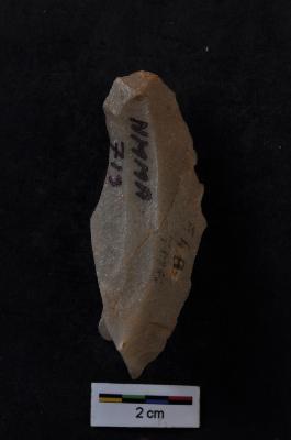 | Description / विवरण | Utilized flake, two vertical ridges on dorsal surface. |