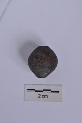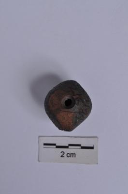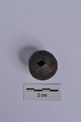 | Description / विवरण | A complete specimen, truncated biconical shape, heavy, hollow or central perforation, has an partially encrusted surface. |