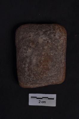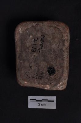 | Description / विवरण | A rectangular piece with a flat broad base, truncated top and sloping sides. Its undersurface is flat and smoothened possibly due to use. |
