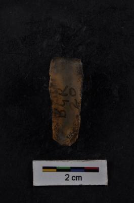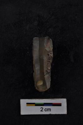 | Description / विवरण | Blade, parallel sided, diffused bulb with prepare striking platform at proximal end, three ridges on dorsal surface, use-ware marks on both working edges. |