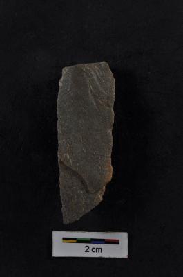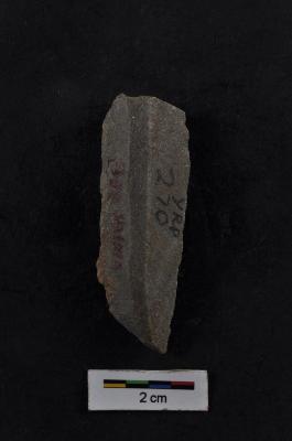 | Description / विवरण | Blade, parallel sided, diffused bulb with striking platform at proximal end, two ridges on dorsal surface, use-ware marks on both working edges. |