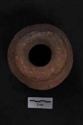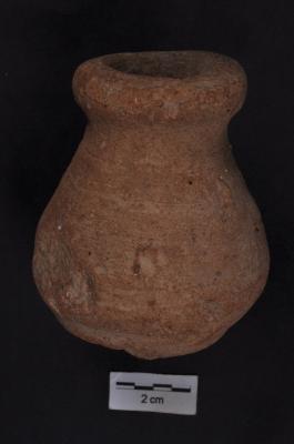 | Description / विवरण | A complete pot with flat base, bulged body, straight neck, of coarse fabric, fired red and weathered surface. |