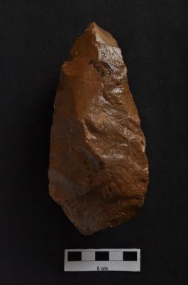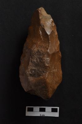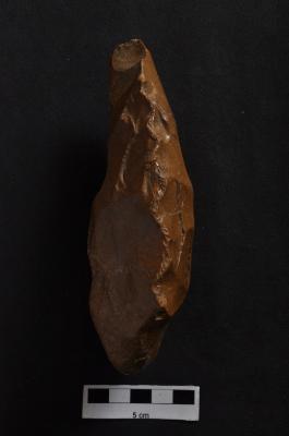 | Description / विवरण | Handaxe, bifacial, long, retouches along the periphery. |