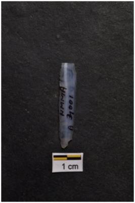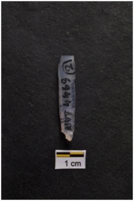 | Description / विवरण | Blade, parallel sided, prominent bulb with striking platform at proximal end, use-ware marks on both working edges. |