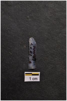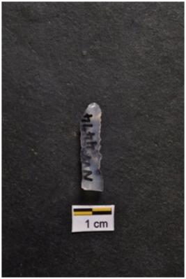| Description / विवरण | Blade, parallel sided, prominent bulb with striking platform at proximal end, use-ware marks on both working edges. |