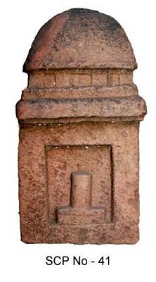| Description / विवरण | A miniature temple model with a vesara sikhara on the top. On the front is a square niche containing a tall siva linga placed on a pedestal. |