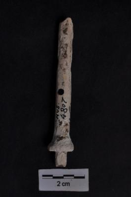 | Description / विवरण | An elongated broken straight sided bone kohl stick flaked off body, flared head, first stage. It has a knob at the distal end it is white in colour and has an abraded surface. |