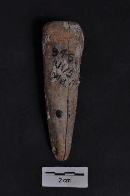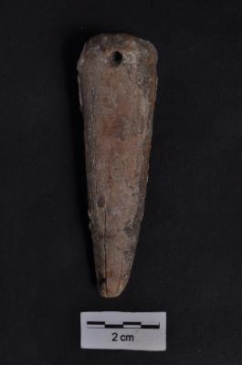 | Description / विवरण | A piece of horn triangular in outline, with a perforation at the apex, another partial perforation at the base. |