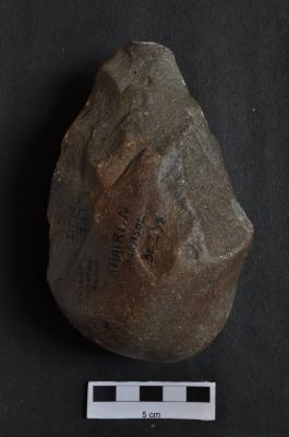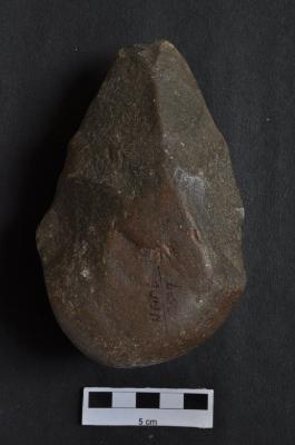 | Description / विवरण | Handaxe, pear shaped, made on pebble, cortex visible on butt end. |