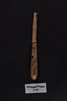 | Description / विवरण | Complete specimen, broken in two fragments, elongated bulbous head, body tapering to a point, light brown in colour and polished body |