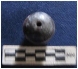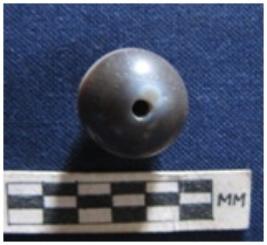 | Description / विवरण | Bead of spherical shape. It is blue in color with white banded and partially broken. |