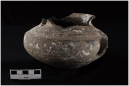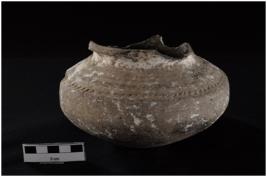 | Description / विवरण | Jar with carinated handi, with out carved rim, circular base, medium course fabric ware, grey in colour. It is decorated by incised design on shoulder polish on the surface. |
