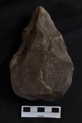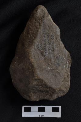 | Description / विवरण | Handaxe, made on pebble, pear shaped, round butt end with some part of cortex, |