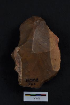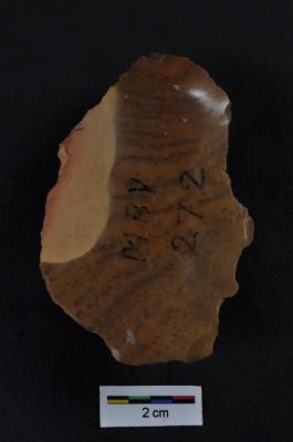 | Description / विवरण | Retouched flake with prominent bulb on ventral surface. |