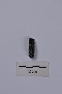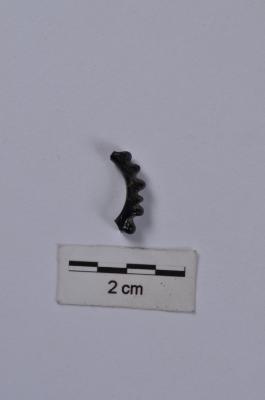 | Description / विवरण | Fragment of a black glass ring with serrated edge, formed by affixing tiny lumps of black glass |