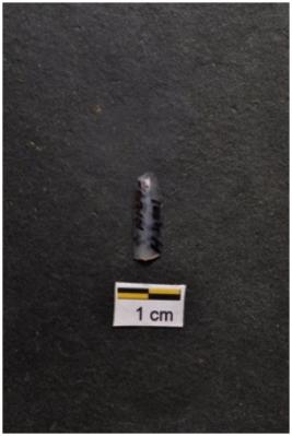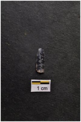 | Description / विवरण | Blade, parallel sided, prominent bulb with striking platform at proximal end, use-ware marks on both working edges. |