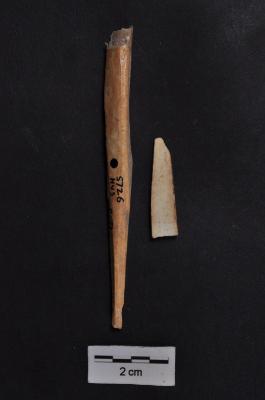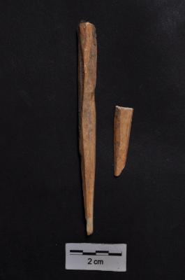 | Description / विवरण | A long elongated broken double ended biconical shape bone point, with a circular cross section, brown in colour, and unpolished |