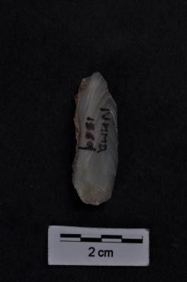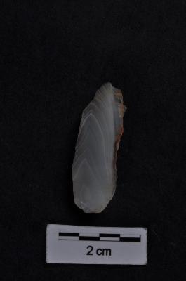 | Description / विवरण | Utilized flake, prominent bulb with prepare striking platform, one working edge with retouches on it, cortex visible on another edge, two uneven ridges on dorsal surface. |