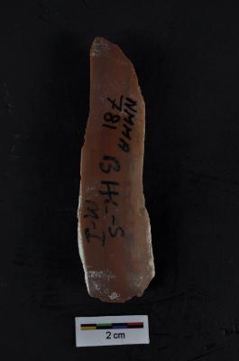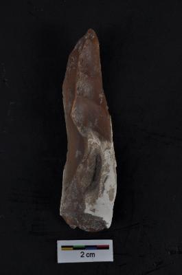 | Description / विवरण | Blade, diffused bulb with striking platform, uneven ridge on dorsal surface, use-ware marks on both working edge. |