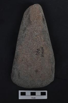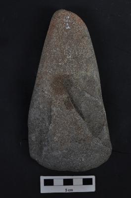 | Description / विवरण | Stone axe with convex end, tapering butt end, smooth surface. |