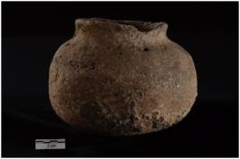 | Description / विवरण | Pot with globular body, flat base, out carved rim, four perforation in body, grey in colour, medium coarse fabric & well fired. |