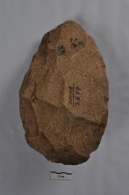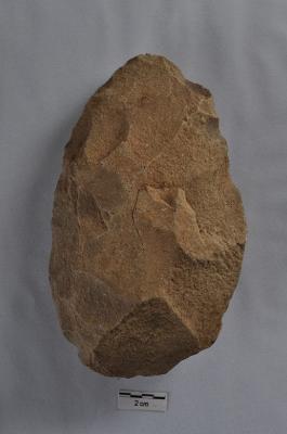 | Description / विवरण | Leaf shaped handaxe, bi-facial, retouches along the periphery. |