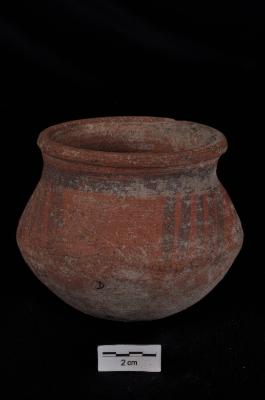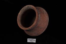 | Description / विवरण | A complete vessel with constricted neck, round rim, a slight carination at the belly round base. The bottom seems to have been fashioned in a concave mould as the inner surface shows finger tips. |