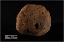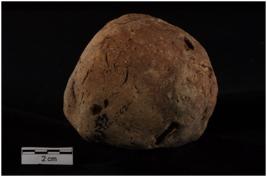 | Description / विवरण | Mushtika, Round in shape, handmade, medium coarse fabric, well fired, husk impression on surface, abraded surface, red & grey in colour. |