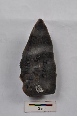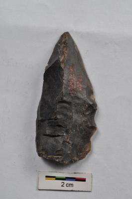 | Description / विवरण | Flake, with one pointed end, diffused bulb with striking platform at proximal end, flaking on dorsal surface. |