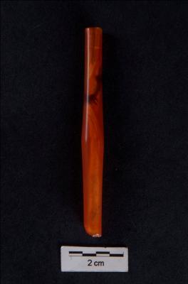| Description / विवरण | Tubular bi-conical shaped bead, circular cross-section, smooth polished surface, with perforation. |