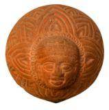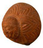 | Description / विवरण | A terracotta lid of a pot having flat bottom and hemispherical body topped by a human figurine. The hemispherical portion is decorated with multiple lotus petal design. The head is upwards i.e., towards the sky. Behind the head is a rayed circle. Rays are depicted with small lobels. He is shown with round face, long snubbed nose, diamond shaped eyes with bulged eyeballs, thick eyebrows, thick lower lip, elongated ear lobes. He wears three tiered beaded head gear. Probably represents the depiction of Surya. |