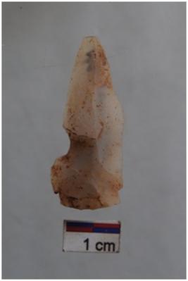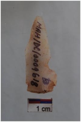 | Description / विवरण | Blade, diffused bulb with striking platform at proximal end, pointed distal end, a ridge on dorsal surface, use-ware marks on both working edges. |