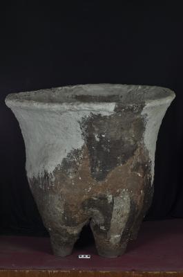 | Description / विवरण | Large four legged clay jar with a wide mouth and cylindrical body; the legs are hollow from within. |