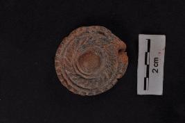 | Description / विवरण | Pendent bi-convex in outline, one surface has dots & rope design with knob in center, vertical perforation. |