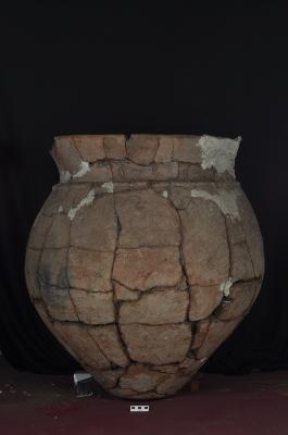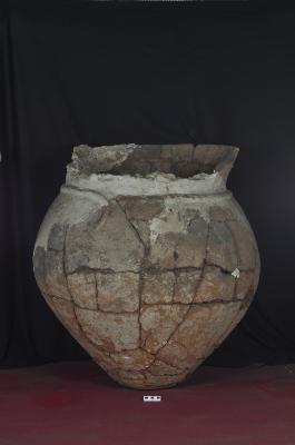 | Description / विवरण | Handmade large storage jar with tapering base. It has punctured incisions on the neck. |