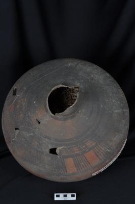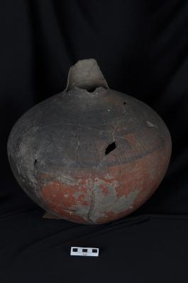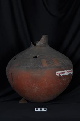 | Description / विवरण | A jar with globular body, vertical neck and possibly with beaded rim which is broken. It is painted on the outer surface in the form of oblique vertical strokes set in panels of horizontal bands. |
