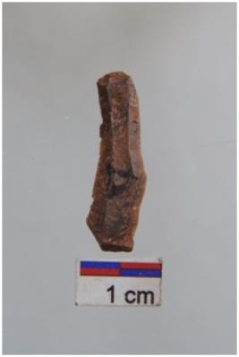 | Description / विवरण | Blade, diffused bulb with striking platform at proximal end, two ridges on dorsal surface, use-ware marks on both working edges |