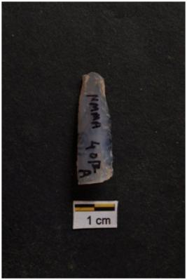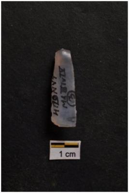 | Description / विवरण | Flake, with tapering sides, prominent bulb with striking platform at proximal end, use-ware marks on both working edges. |